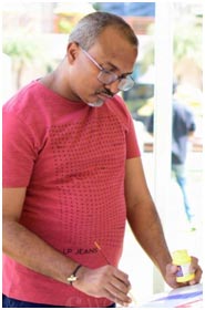 The world of Thota Laxminarayana is just such a place, a languid harmonious paradise, which he brilliantly captures in his artworks. The multitude colours of the rainbow, the happy birds on tree tops or just posing in the backdrop, or sitting atop a content buffalo wallowing in the waters, the simple folks going about their lives, people at ease, the canvas is rich, exuding a sense of happiness and a feeling of ‘all is well with the world’. There is an almost childlike perspective of the world, where everything is his own take on the real, further embellished with his imagination, all melded in primary colours. The artist’s eye sees beyond the mundane ordinariness of the scape, a paradise garden. His is the kind of work that uplifts the heart and brings a smile every time I see it.
